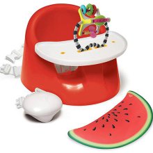 Chair). We chose this one over the Bumbo for the simple reason of the price for what you got. It had everything included and more compared to what came with the Bumbo chair (the tray was a separate item you could purchase). It comes with a tray that easily comes on and off, has divots in the tray for the toy that comes with it, an attachment to put in place of having the tray installed and two place mats. D just LOVED sitting in there while we were cooking in the kitchen or eating dinner. (We allowed him to sit in it while on the kitchen counter because our kitchen counters have two levels, thus allowing him unable to fall back if he pushed back from his strength, if he ever were to. The Bumbo chair has been recalled because children have fallen and severely hit their head. So just use common sense when using such devices and NEVER leave a child unattended!) As he got older he also has used it as a high chair when we’re out at a friends house.
