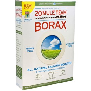 Borax is a popular natural cleaner that has countless uses throughout the household and beyond.  We use it mainly in our homemade laundry detergent (please see the next post to learn how to make it).  By itself, Borax is also an excellent de-greaser and stain fighter – it breaks down and turns into Hydrogen Peroxide, which is the main ingredient in OxiClean.  Another use for Borax, which we use lots, is for a bug repellent – we mix Borax and water in a spray bottle and spray around the house (inside and out) for bugs.  This is the perfect natural solution when there’s little ones in the house.